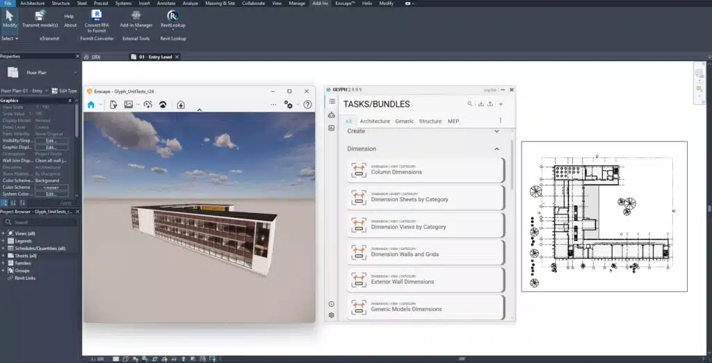 Si vous utilisez déjà Enscape pour visualiser vos modèles 3D en temps réel, Glyph s’insère naturellement comme l’autre moitié de votre workflow Revit : après avoir modifié un espace dans Enscape, vous pouvez générer automatiquement le jeu de plans actualisé en quelques secondes, sans quitter Revit. Résultat : créativité et documentation restent synchronisées