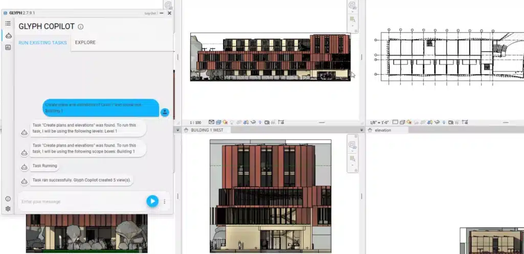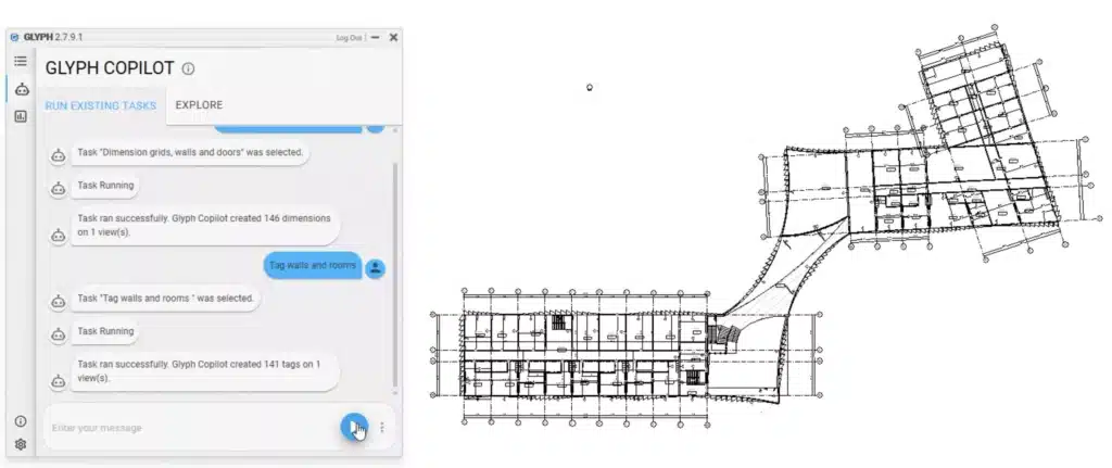 Mais ce n’est pas qu’un simple automatisme : Glyph intègre aussi une expérience « Copilot » — un assistant intelligent basé sur l’IA avec lequel vous pouvez communiquer en langage naturel pour lancer vos automatisations : par exemple, « crée les plans cotés pour le niveau 2 et étiquette toutes les pièces » — et tout se fait automatiquement.