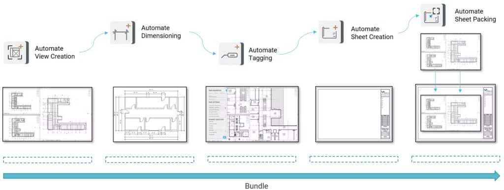 Lancement d’un workflow complet (plans, élévations, jeu de plans complets) en une seule action.